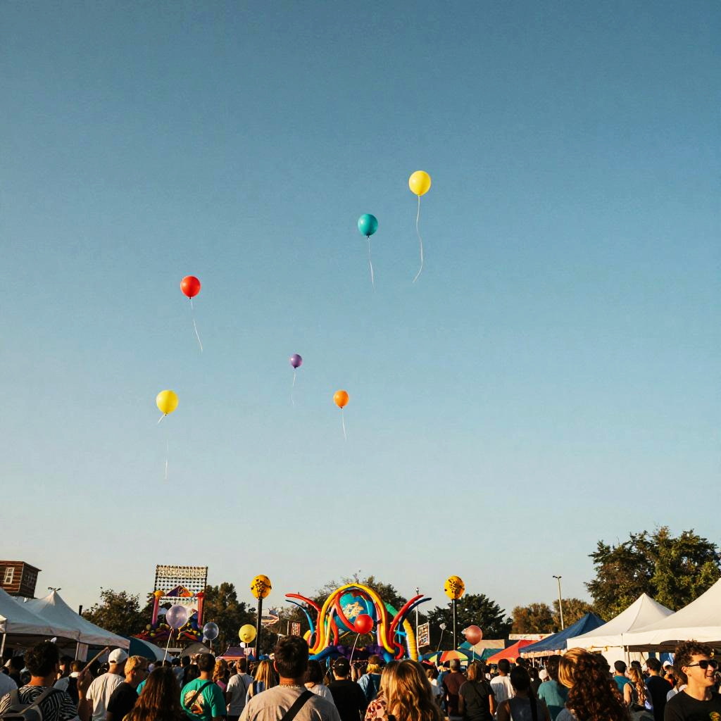 Released balloons drifting into a clear blue sky during a lively festival, colorful ribbons trailing, happy crowd watching below, festive decorations, cinematic wide-angle view, vibrant and joyful scene