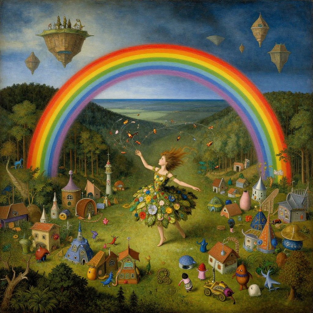 Craft an image showcasing surreal and intricate details reminiscent of Hieronymus Bosch's work, depicting a sprawling landscape viewed from above with a radiant rainbow stretching across a verdant forest. At the rainbow's base lies a whimsical village filled with fantastical creatures and unique architectural designs blending reality and fantasy seamlessly. In the heart of this peculiar settlement, an untamed-haired young girl dons an enchanted dress woven from leaves and flowers, dancing elegantly as she summons an enchanting display of insects that weave intricate patterns around her, creating a captivating ballet of nature. The sky above shifts with dramatic color contrasts and features mysterious, floating islands reminiscent of a dreamy realm, instilling the viewer with a sense of awe and magic.