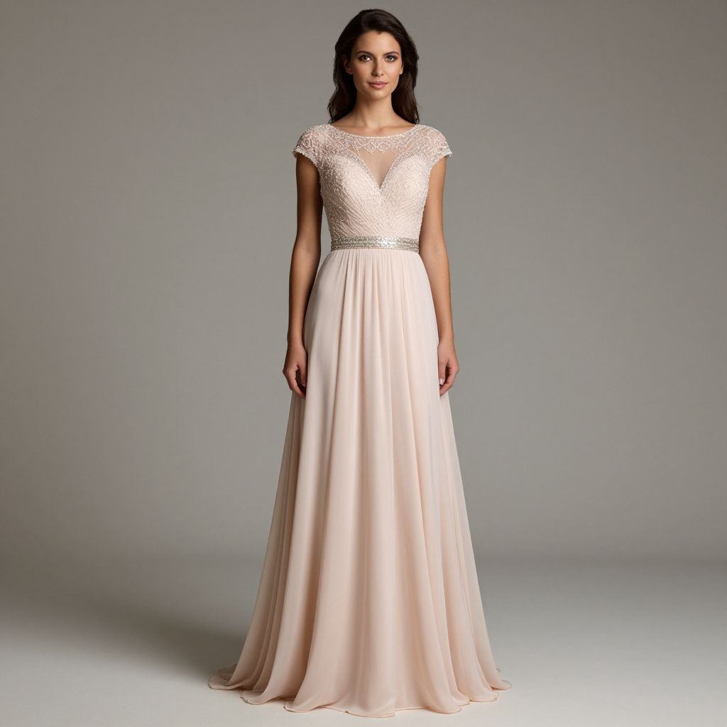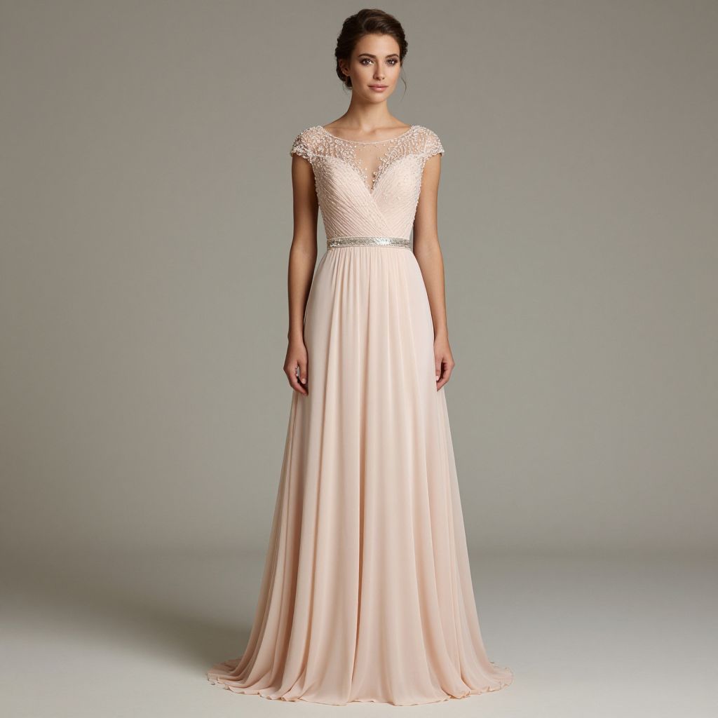 Elegant woman wearing a blush pink wedding dress with intricate beadwork on the bodice, a shimmering silver belt, and flowing chiffon skirt, standing gracefully against a neutral background.