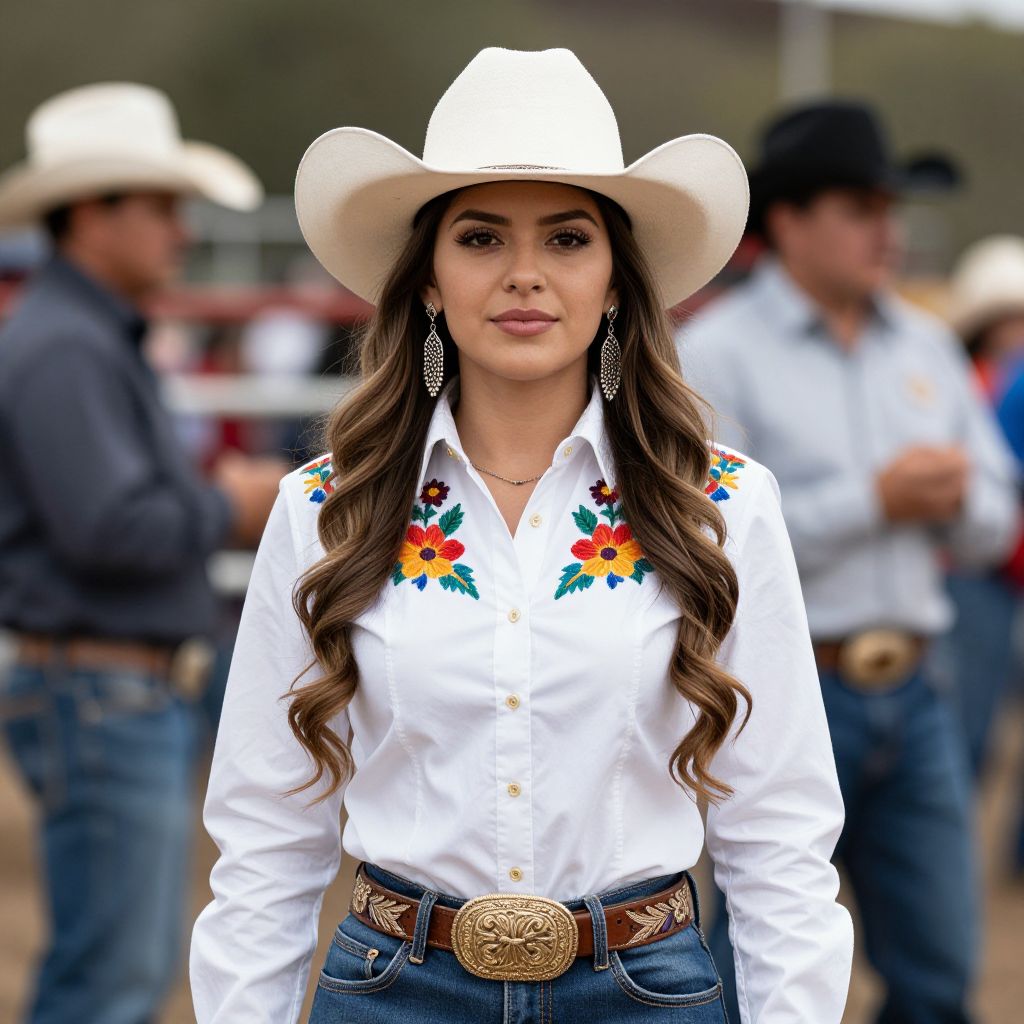 Photograph of a beautiful Latina woman with long, wavy brown hair, wearing a white cowboy hat and a white button-up shirt adorned with colorful floral embroidery on the shoulders. She has large, dangling silver earrings and is dressed in blue jeans with a brown belt featuring a large gold buckle. She's standing in a blurred outdoor setting with other people wearing cowboy hats, suggesting a rodeo or western event.