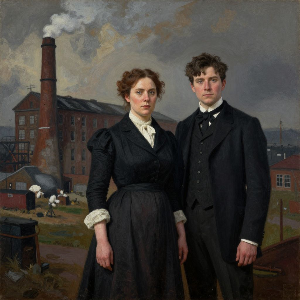 Photorealistic painting of a 19th-century couple standing in an industrial landscape with a smoking factory in the background. Both wear black Victorian attire,