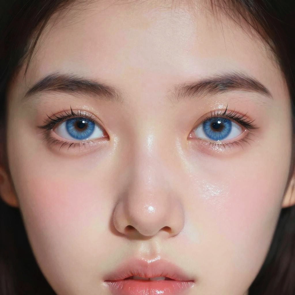 This is a close-up, hyper-realistic digital painting of a young woman's face, focusing on her eyes and nose. Her bright blue eyes are striking with detailed irises, and she has long, dark eyelashes. Her skin is smooth with a glossy, almost wet appearance. She has light pink cheeks and a small, slightly upturned nose. The lighting creates reflective highlights, adding a surreal, almost ethereal quality to the image.