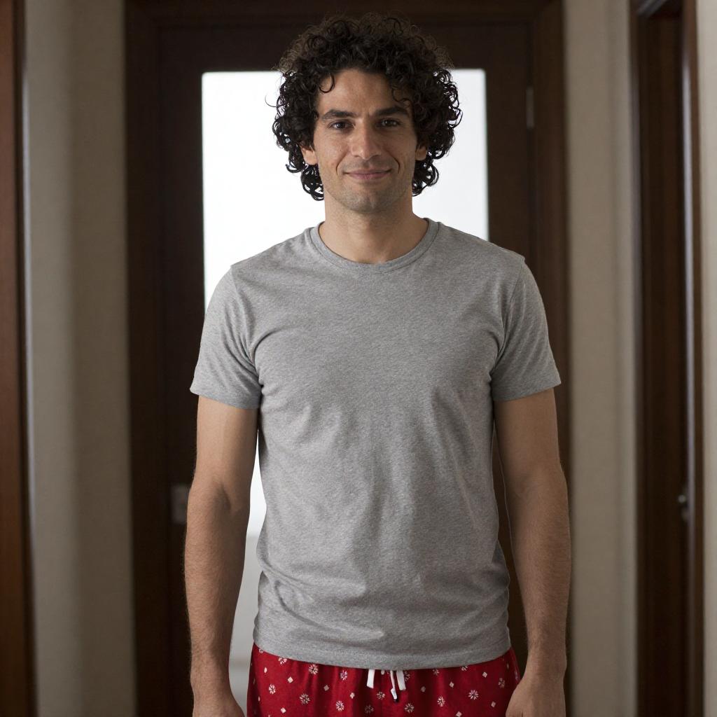 Photograph of a man with curly dark hair, light skin, and a slight smile. He wears a gray t-shirt and red pajama pants with a white pattern. He stands in a dimly lit room with a wooden door in the background, illuminated by a bright light from behind him.