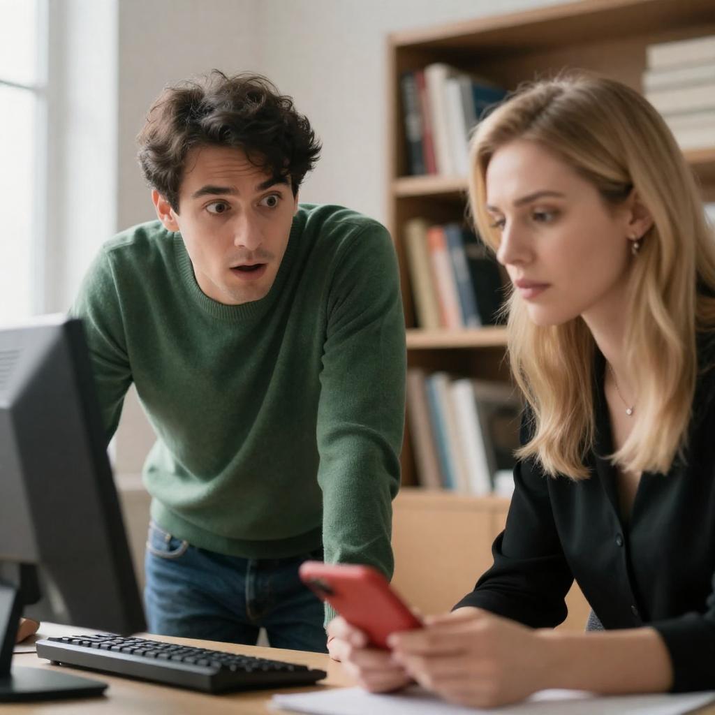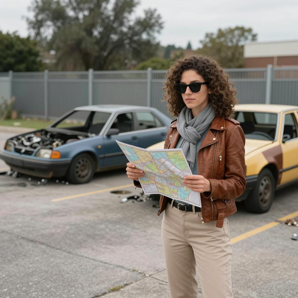 Photograph of a garage workshop. Two people in the foreground, woman with curly brown hair, blue checkered dress under white lab coat, man with brown hair, striped shirt over brown t-shirt, holding a wrench. Background has shelves, tools, signs, and two other people. Green car in the foreground. Overhead fluorescent lights.