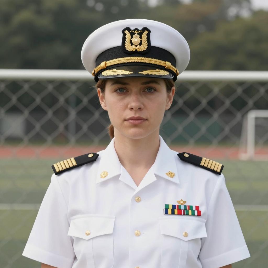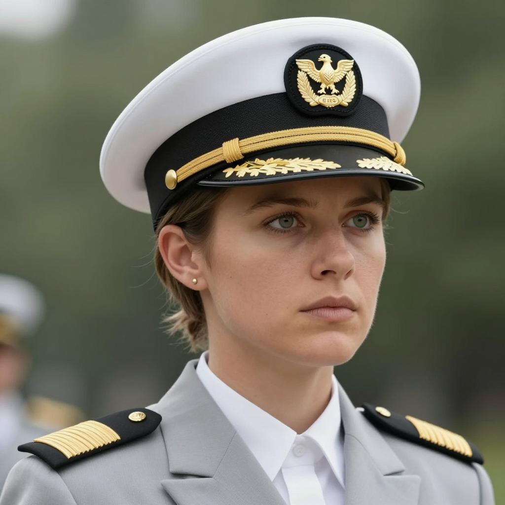 Female naval officer with fair skin, green eyes, and short brown hair wears a white and black cap with a gold eagle emblem, white collar shirt, and gray uniform with gold epaulettes. Background has blurred green trees and light. Face is serious, slightly looking to the right. Upper body visible. One small gold earring on the left ear.