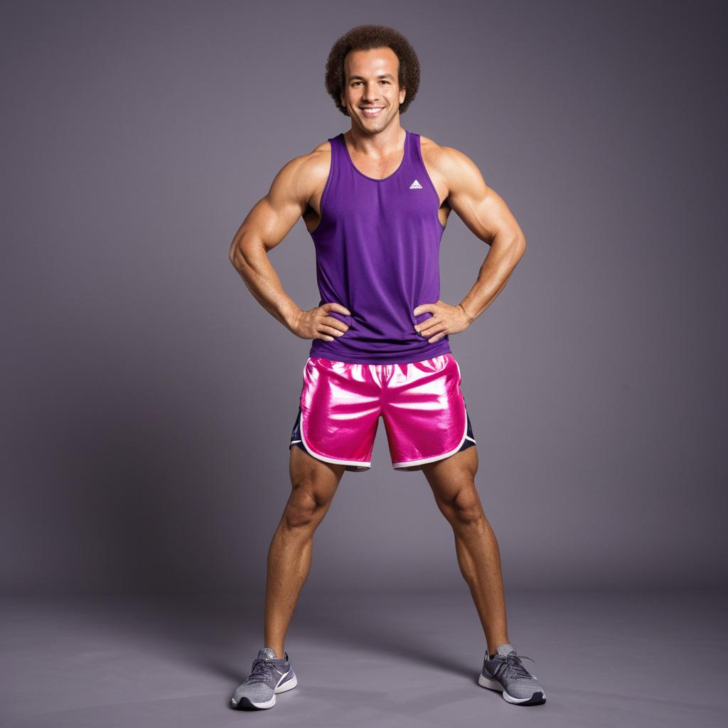 Richard simmons workout, photorealistic, male, muscular, medium skin tone, short brown hair, smiling, standing, hands on hips, wearing, purple tank top, pink shiny shorts, gray background, studio lighting, fitness, athletic, mid-30s, toned arms and legs, no background objects, front view, full body shot, digital photography, realistic ures