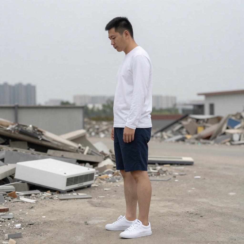 Asian man with short black hair, wearing white long-sleeve shirt, navy shorts, white sneakers, standing in profile. Background: overcast sky, rubble-filled landscape, white appliance on ground, scattered debris. Man looks down, neutral expression. Urban setting, distant buildings.