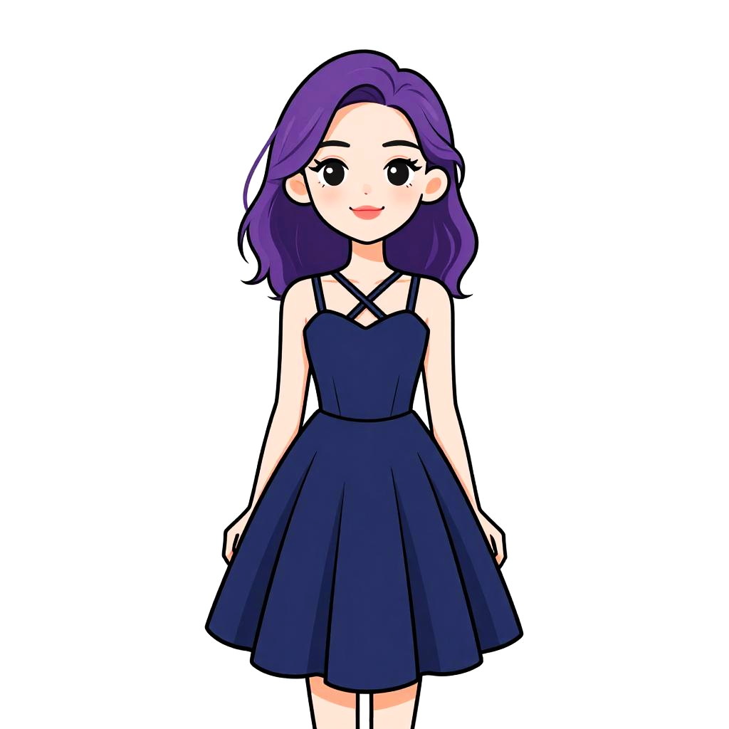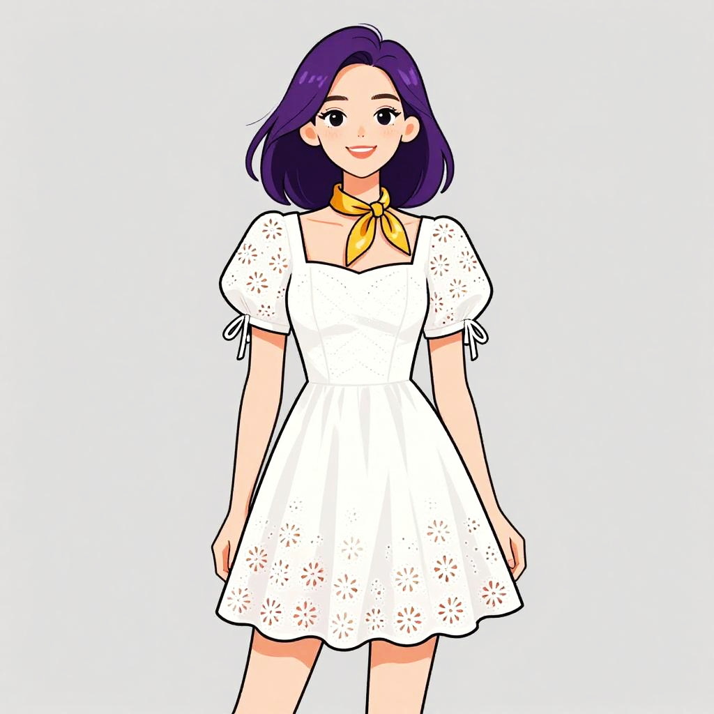 Woman with pretty face and pretty hair. Woman, romantic style, black lace dress with floral embroidery in pastel colors, short cap sleeves, round neckline, fitted bodice, flared skirt above the knee, scalloped lace hem, white background. --sref 1467
