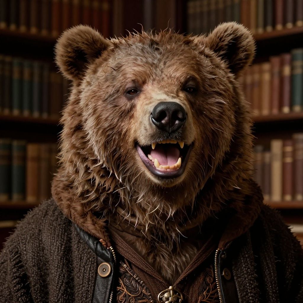 A medium 40mm funny portrait of Robbie Coltrane as hagrid squeezed eyebrows super laughing, wondering, wet bear, hyper realistic cute photo with no background, dark brown library background, looking at viewer, looking down, from below, (detailed facial features:0.2), high quality, professional photo, 28mm, (intricate detail), ((incredibly detailed skin:0.38)), Surreal Harmony, cinematic, lighting, 8K, HDR10, analog