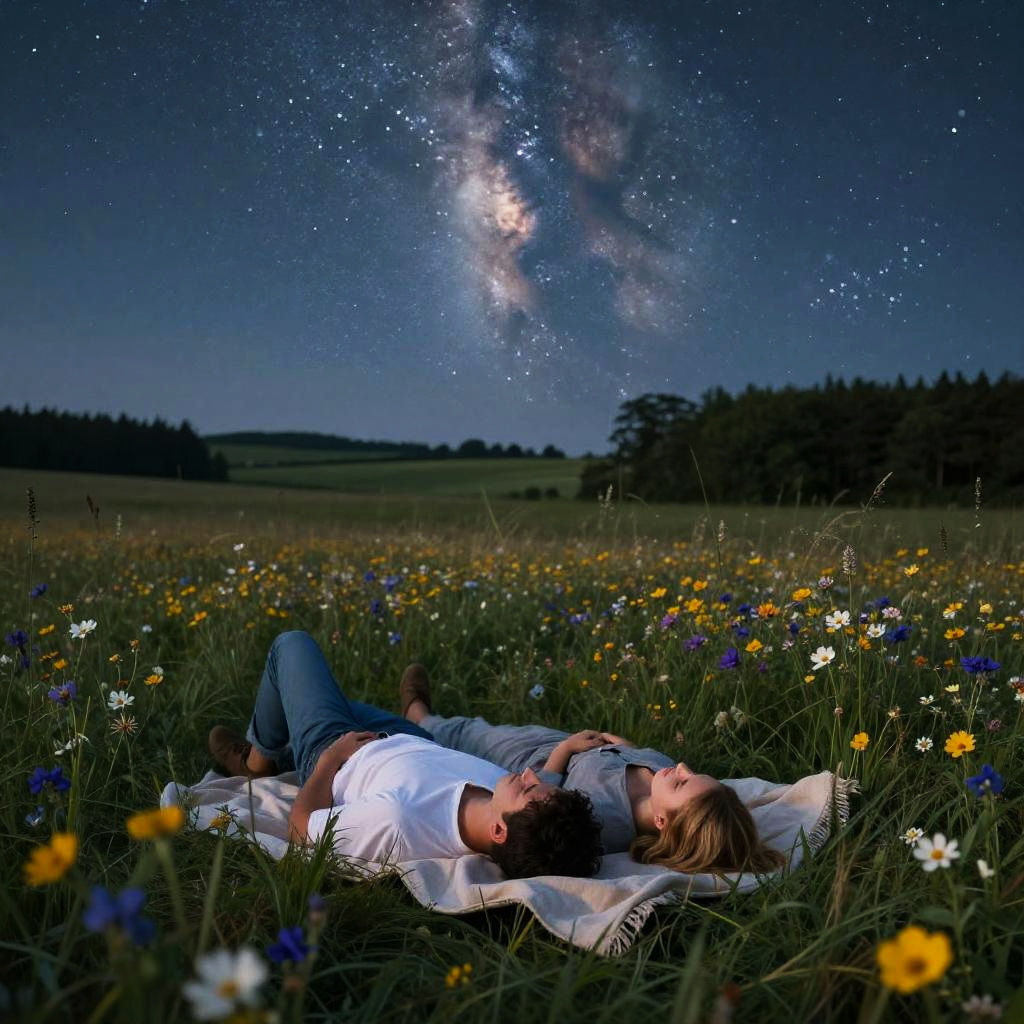 A_romantic_tale in a lush countryside meadow, wildflowers blooming everywhere, a couple lying on a blanket looking at the stars, twinkling constellations above, gentle wind and soft golden light