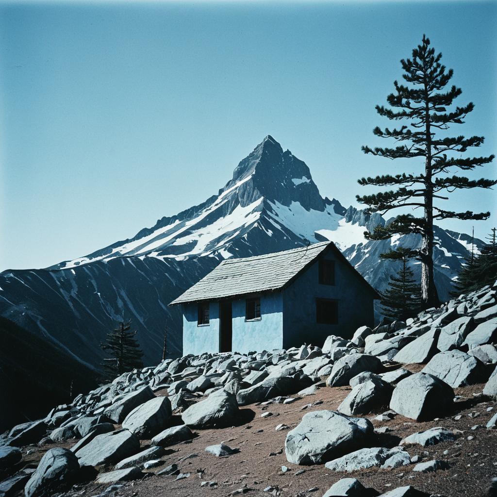 A small blue mountain hut situated on a rocky slope with scattered boulders and sparse pine trees. In the background, a sharp, snow-covered peak rises against a clear blue sky, capturing a serene and solitary alpine environment.