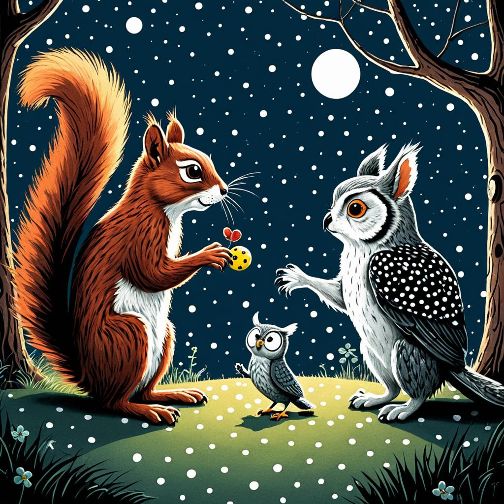 A Dr. Seuss-style illustration of a dragon and a knight, interacting in a playful polka-dot environment. Features playful rivalry, contrasting scales and armor, rendered with whimsical and engaging visual elements.