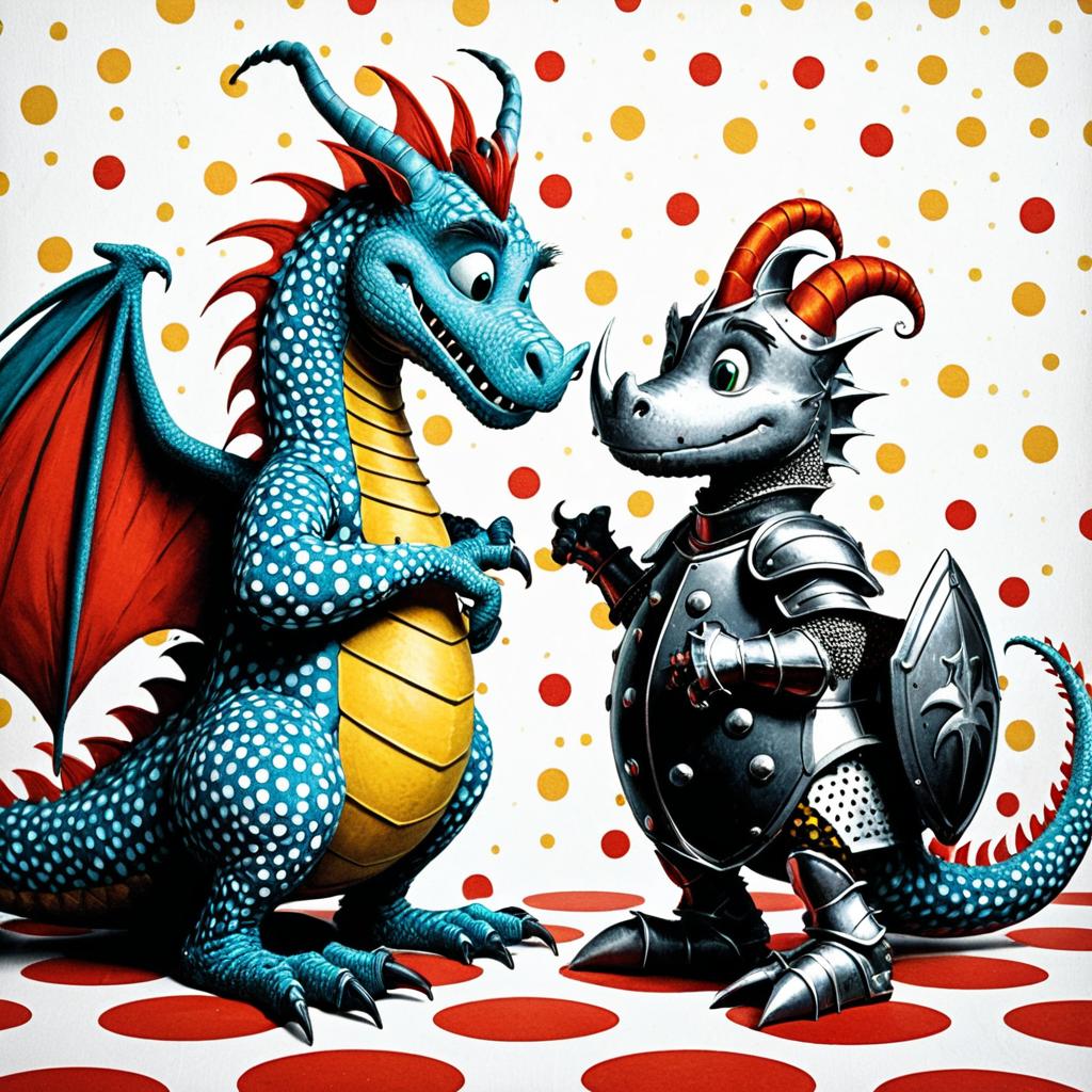 Whimsical illustration in Dr. Seuss style featuring a blue polka-dotted dragon with red wings and a yellow belly playfully interacting with a small armored knight dragon. The knight is clad in shiny silver armor with red accents and orange horns, holding a shield. Both characters are set in a playful environment filled with large red and yellow polka dots on the floor and background, emphasizing a colorful and imaginative scene.