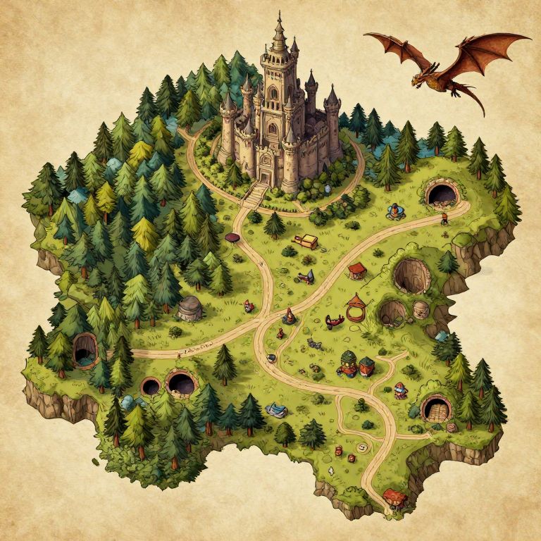 Dnd world generator fantasy map, hand-drawn style with enchanted forests, towering castles, winding roads, hidden caves, dragons flying above, whimsical details, parchment texture background, warm earthy color palette, adventurous mood
