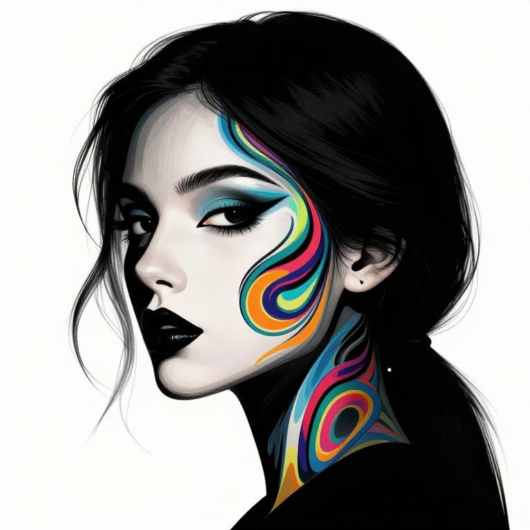 This digital illustration features a white-skinned woman with dark, straight hair in a side profile. Her face is rendered in black and white with striking, colorful abstract patterns in shades of orange, yellow, blue, and red on her cheek and neck. Her lips are painted black, and her eyes are heavily lined with blue eyeshadow. The background is pure white, making the vivid colors and black contrasts stand out sharply. The style is modern and edgy, with a high-contrast, almost comic-book-like aesthetic. The woman's expression is neutral, and her sharp features are accentuated by the bold makeup and color patterns.
