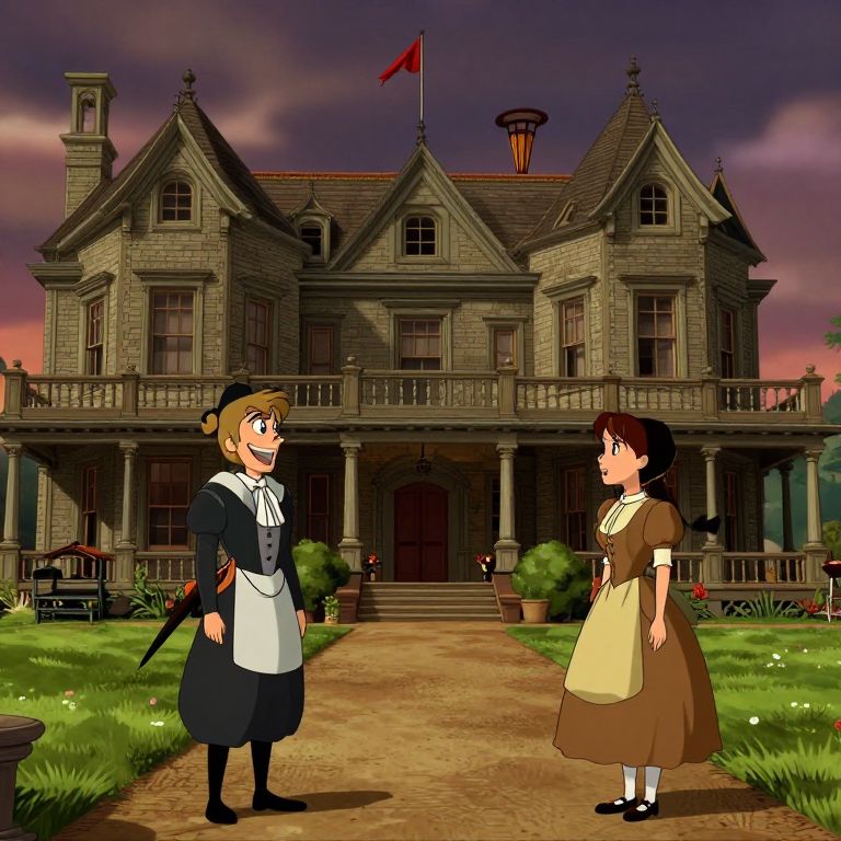 Digital anime-style drawing of two women in vintage maid outfits standing in front of a Gothic-style mansion with a flagpole.