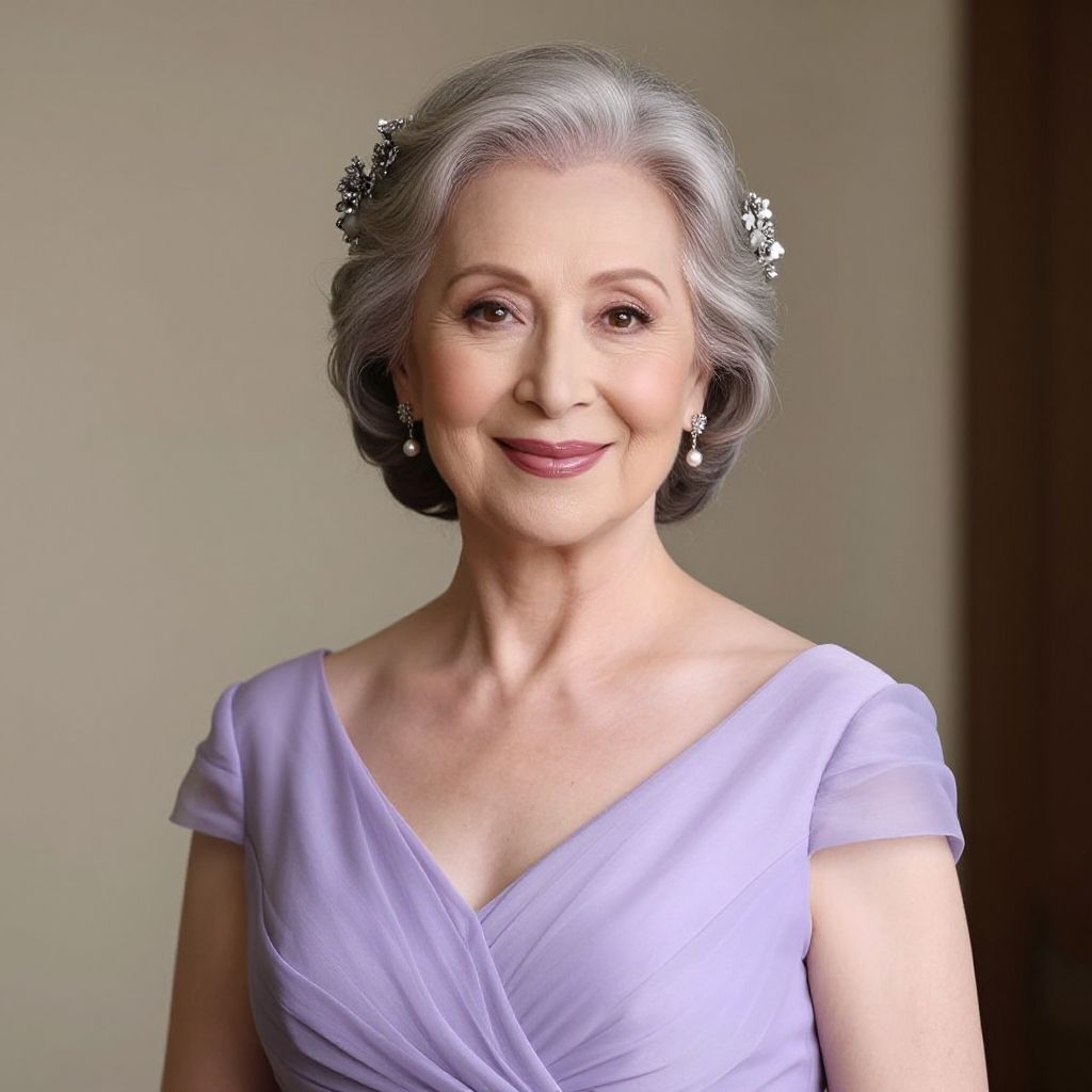 Photograph of an elderly woman with fair skin and silver, wavy hair styled in an elegant updo, adorned with a silver floral hairpiece. She is wearing a light purple, V-neck, short-sleeved dress and matching earrings. Her makeup includes dark red lipstick and subtle eye makeup. She smiles gently, looking directly at the camera. The background is a plain, beige wall with soft lighting, highlighting her refined and poised appearance. The image has a polished, formal quality, emphasizing her grace and elegance.