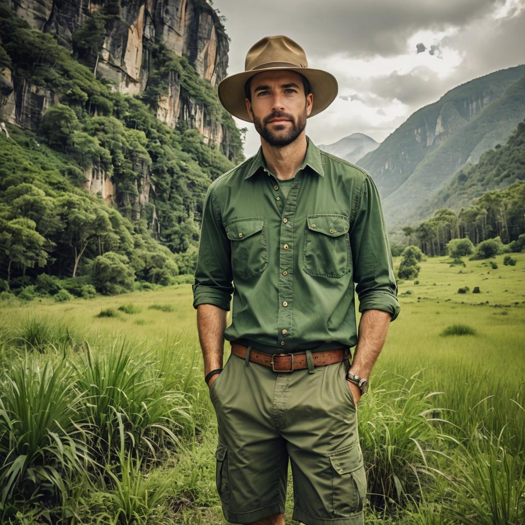 Photo of a Rugged Build man, Pompadour, safari outfit, khaki button-up shirt in Moss Green, cargo shorts in Cotton-polyester blend, wide-brim hat, leather loafers, utility belt, adventure-ready, mountain valley, creative filter