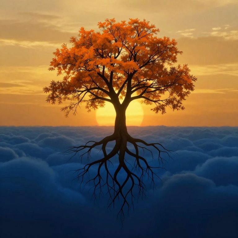A surreal digital artwork depicts a solitary tree with vibrant orange foliage silhouetted against a molten gold sunset, its intricate roots extending downward into a deep blue, cloud-filled abyss, creating a striking contrast between the ethereal sky and the mysterious depths below.