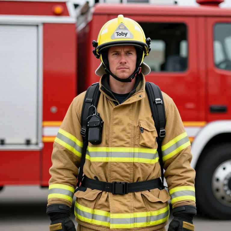 Photograph of a serious-looking male firefighter standing in front of a bright red fire truck. He's wearing a yellow helmet with "Toby" written on it, a tan firefighting coat with yellow and gray reflective stripes, black gloves, and a black backpack. His expression is focused, and the background is slightly blurred, emphasizing the fire truck's red and white colors.