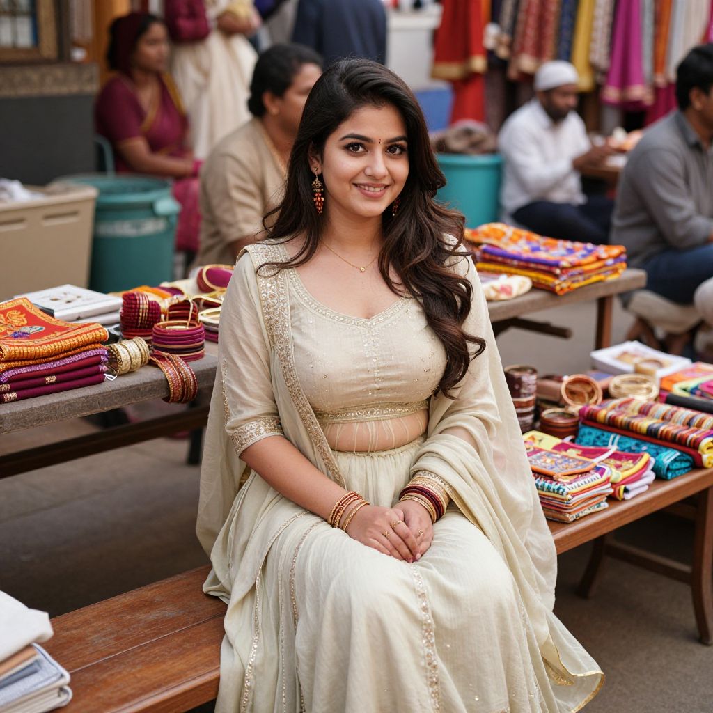 A young woman with olive skin, natural brown eyes, and a playful smile in a line ghagra costume made of flowing silk and subtle sequins, sitting on a wooden bench in a heritage market during a wedding season festival, surrounded by vendors selling bangles and traditional fabrics, the setting lively and rich in cultural detail.. The woman has big tits and cute face