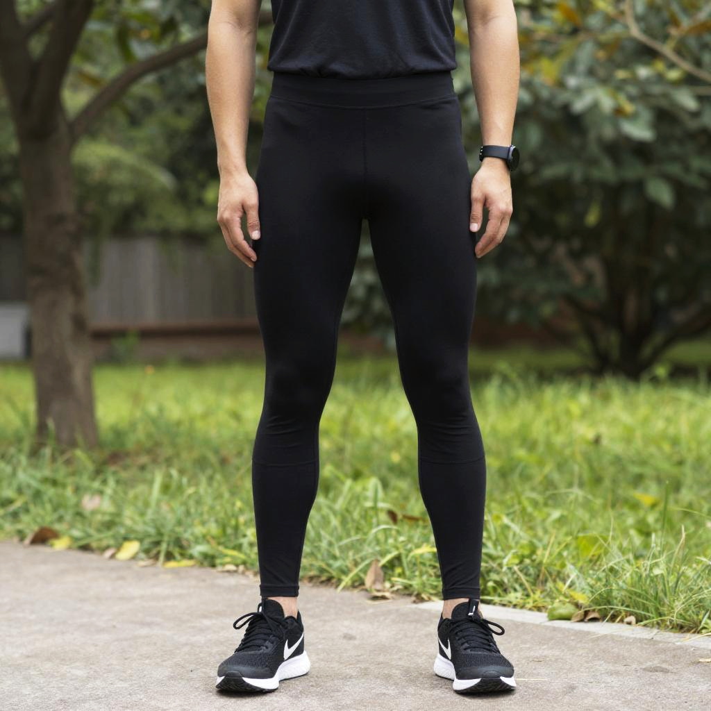 Activewear Leggings, man in black shirt and tight pants standing in a garden