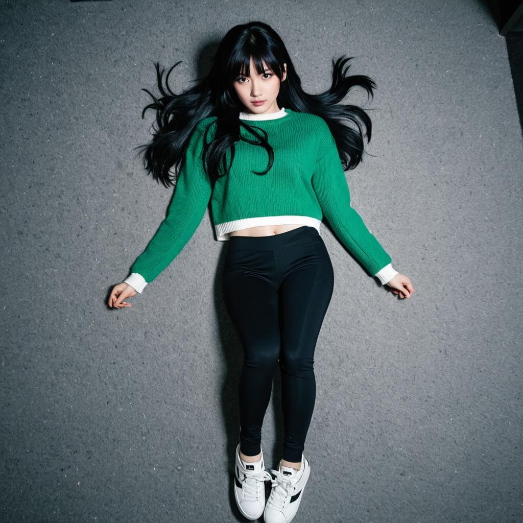 Cosplay, Kuki Sanban, long black hair, snug green cropped sweater, fitted black leggings, white platform sneakers, sexy cosplay costume idea, dramatic lighting, overhead shot