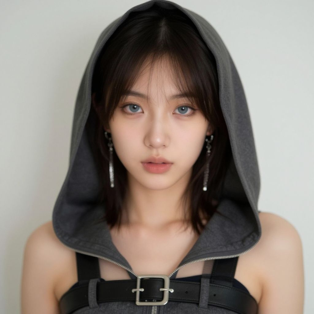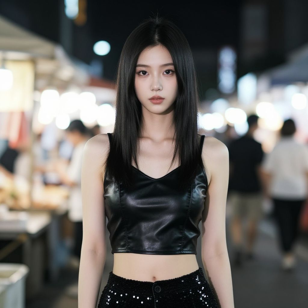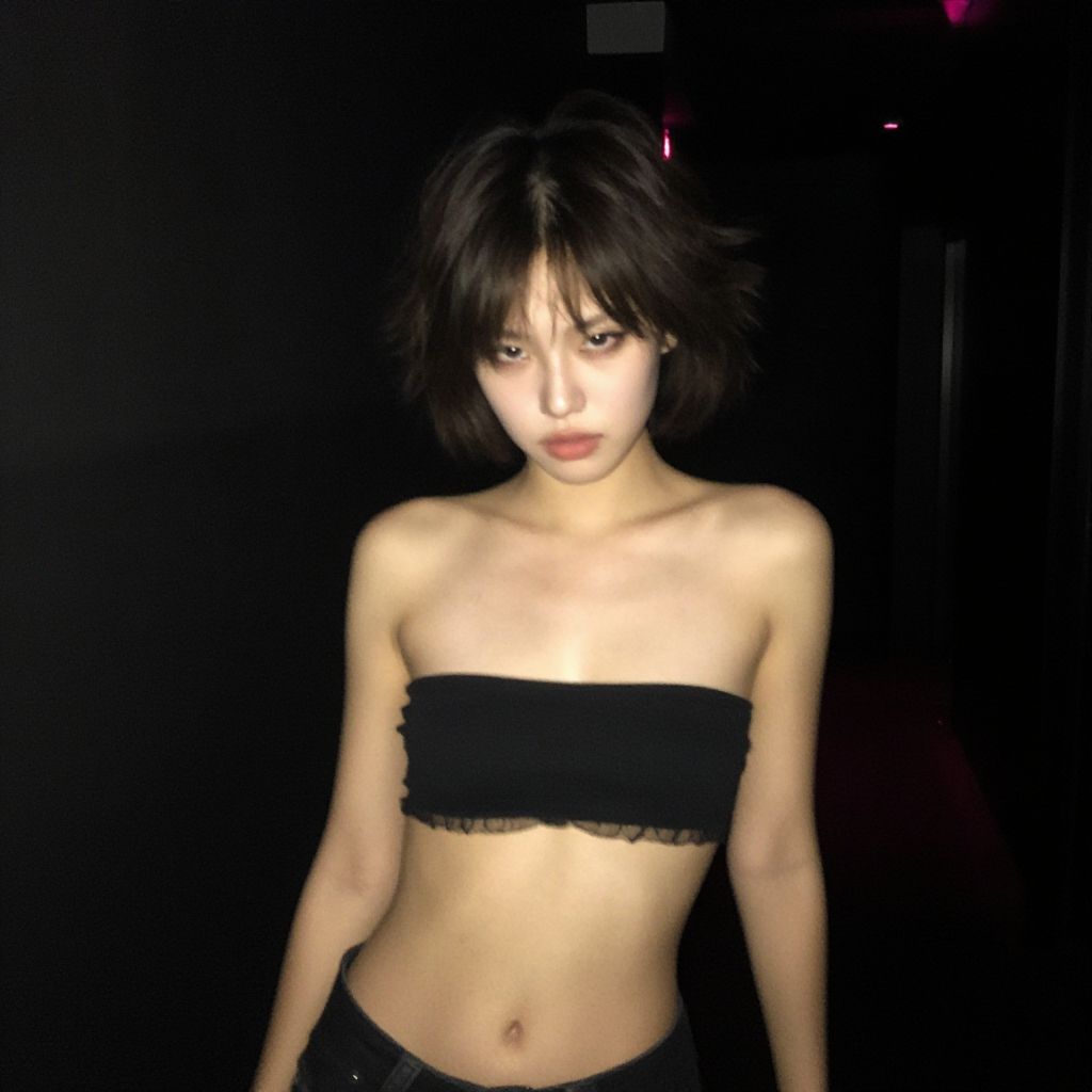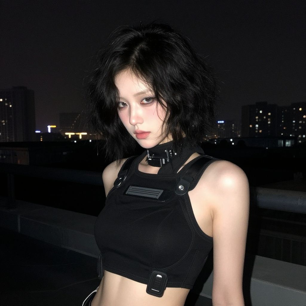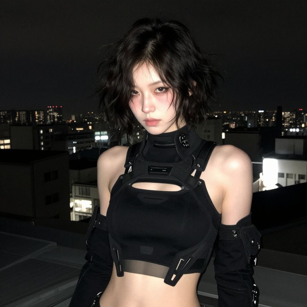 Cyborg young woman, dark cyberpunk, highly detailed face, pale fragile delicate body, frizzy bob cut hair, (stylish haircut:0.9), wearing a tight stylish minimalistic futuristic open black hi-tech tactical techwear crop top with a few symmetrical cutouts, subtle cyberware, standing on a cyberpunk Japanese city rooftop at night, scenic view, cinematic scene, cinematic lighting, analog-style photo, grainy amateur lo-fi portrait photo, desaturated colors, (low contrast), distracted, b-cup breasts, eyeliner, (eyeshadow:1.1), shy, blushing, raw photo, phone photo, 3/4, (upper body portrait shot), medium shot, accidental art, candid, crisp image, high detail, (eyebags:0.8), (chromatic aberration)