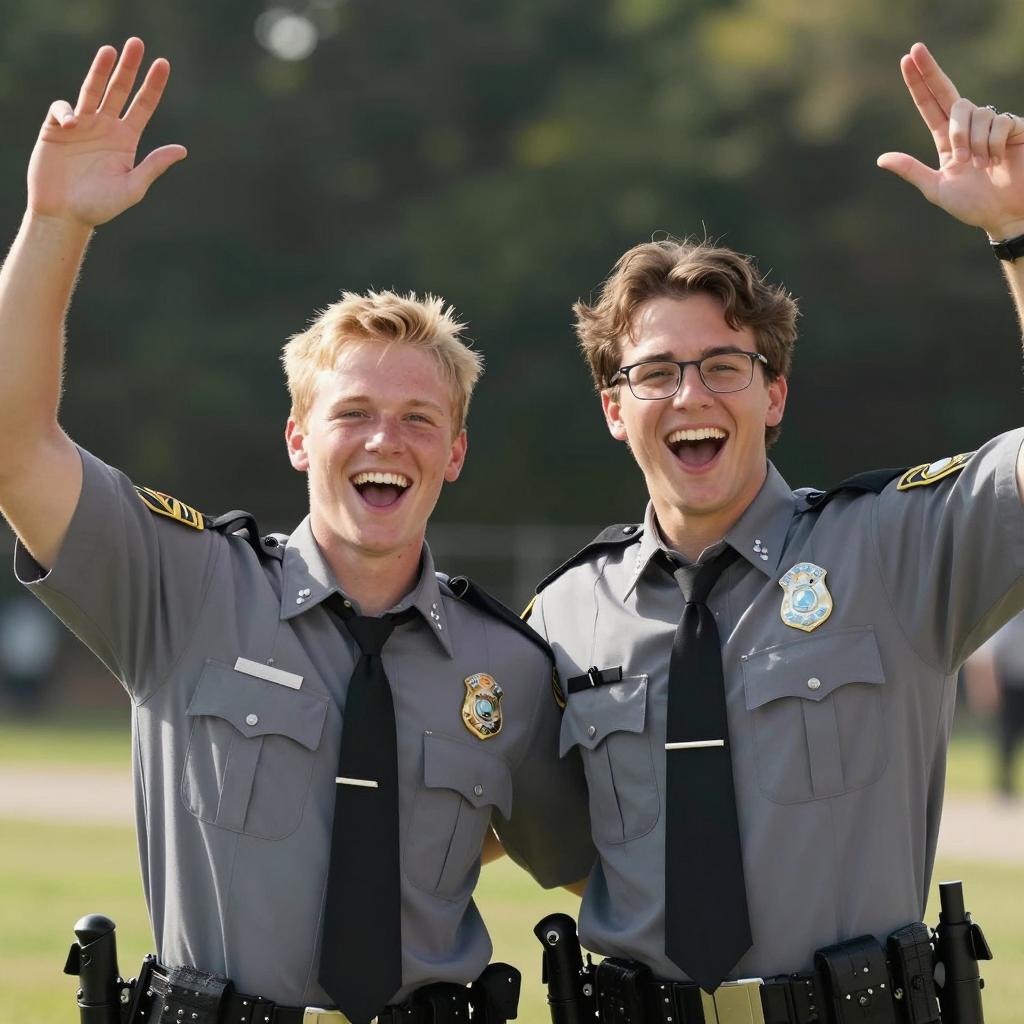 Photograph of two young men in gray police uniforms, outdoors, smiling with open mouths, arms raised. One has short blonde hair, the other glasses and brown hair. Background shows green trees and grass. Sunlight illuminates their faces.
