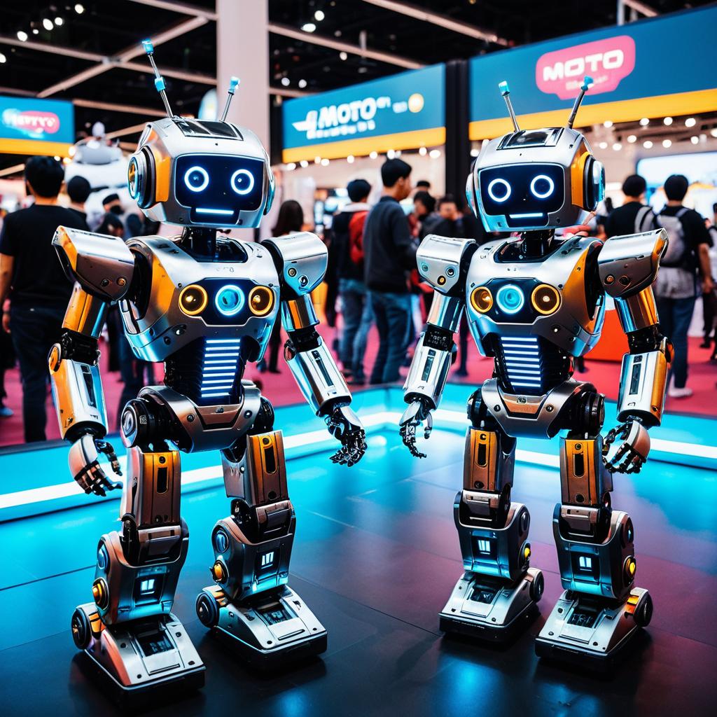 Two cheerful robots with shiny metallic armor and LED accents standing on a glowing platform at a busy technology fair. The background features an exhibition space with people and bright digital displays, highlighting a futuristic and family-friendly atmosphere.