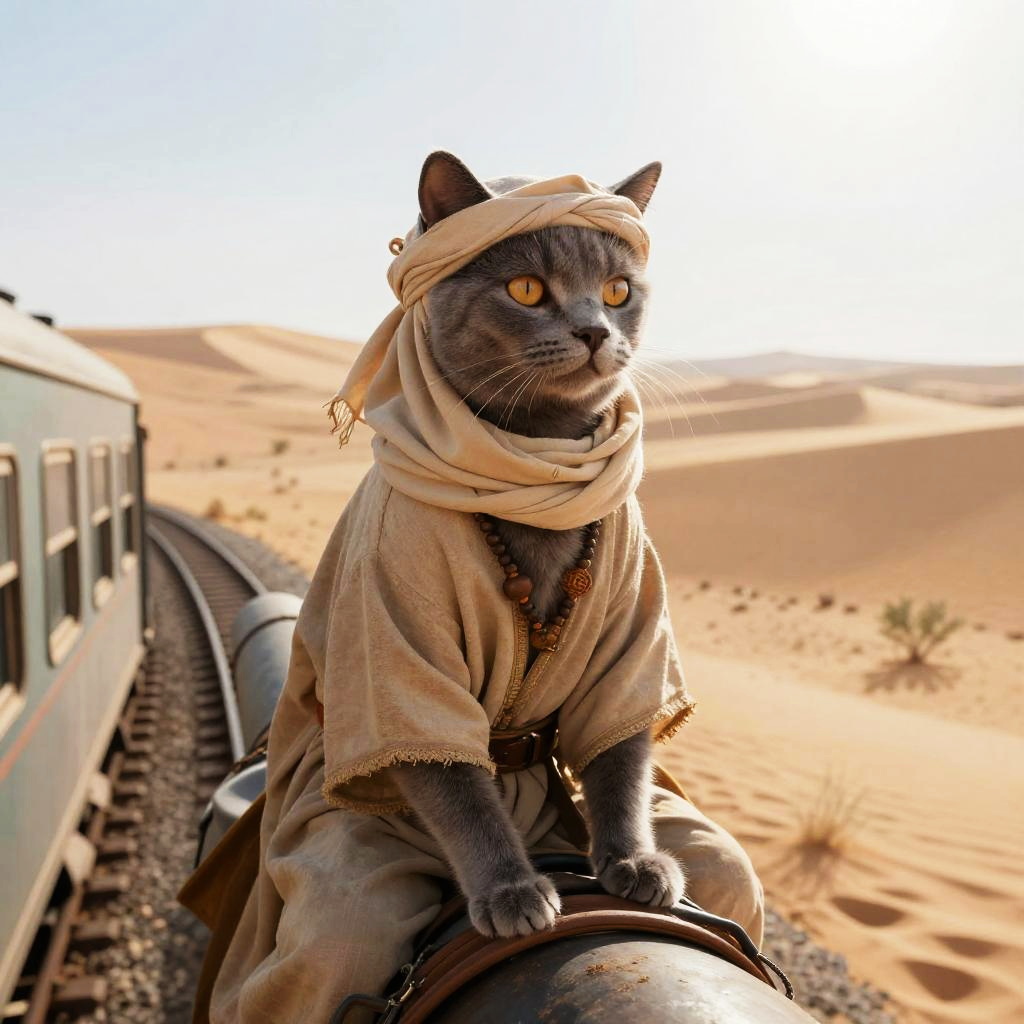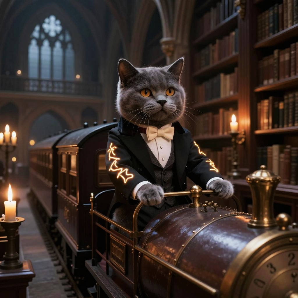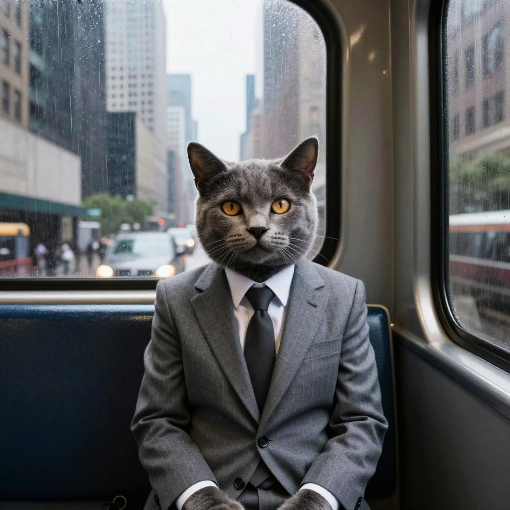 A gray cat wearing a classic detective trench coat and fedora riding a train through a rainy noir city street with vintage cars, Hollywood movie style, hyper-realistic, 8K resolution, natural lighting, cinematic composition