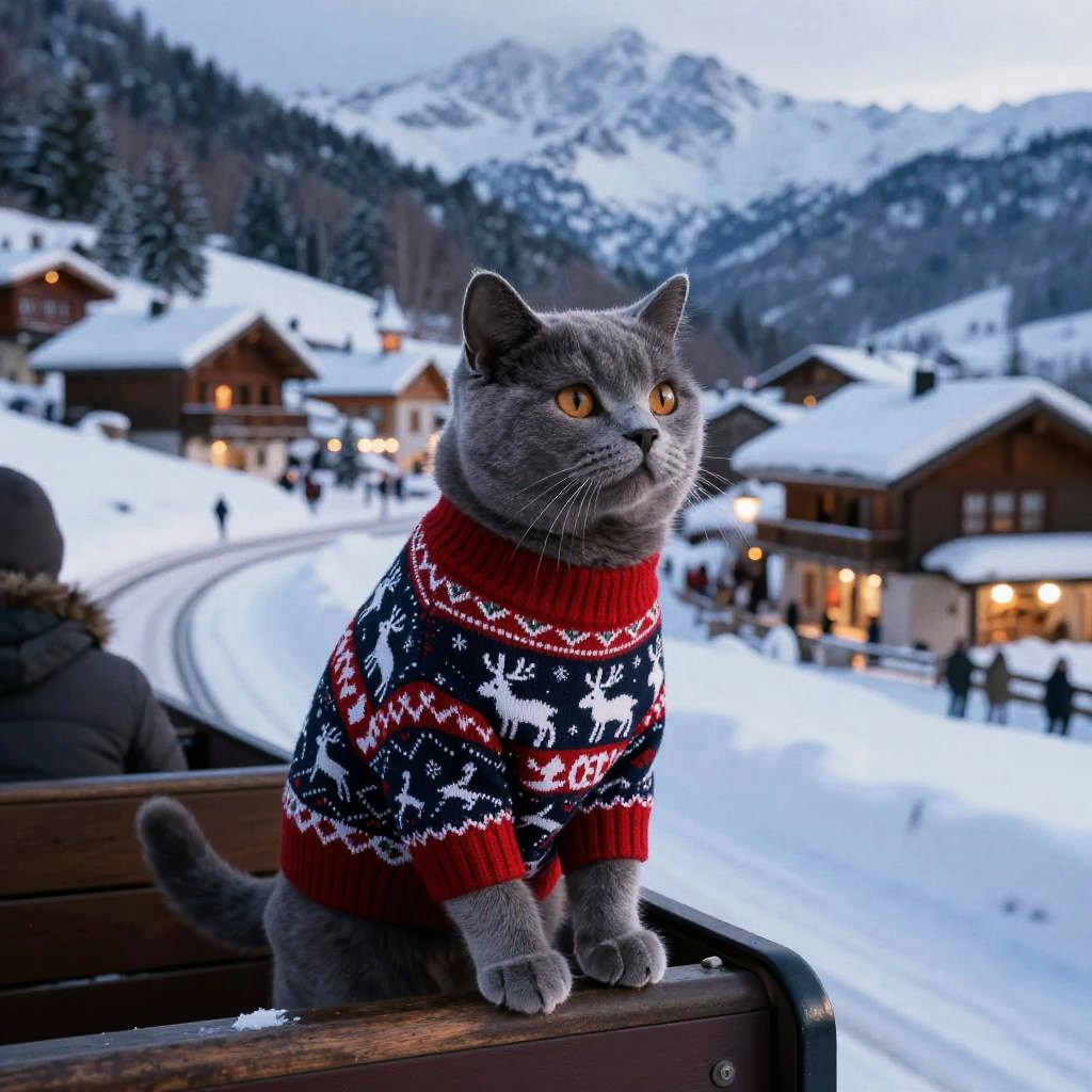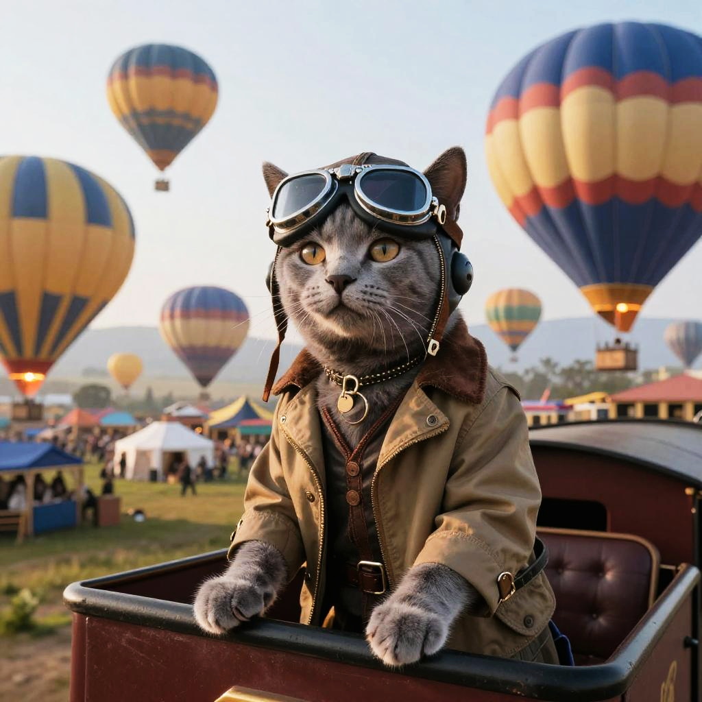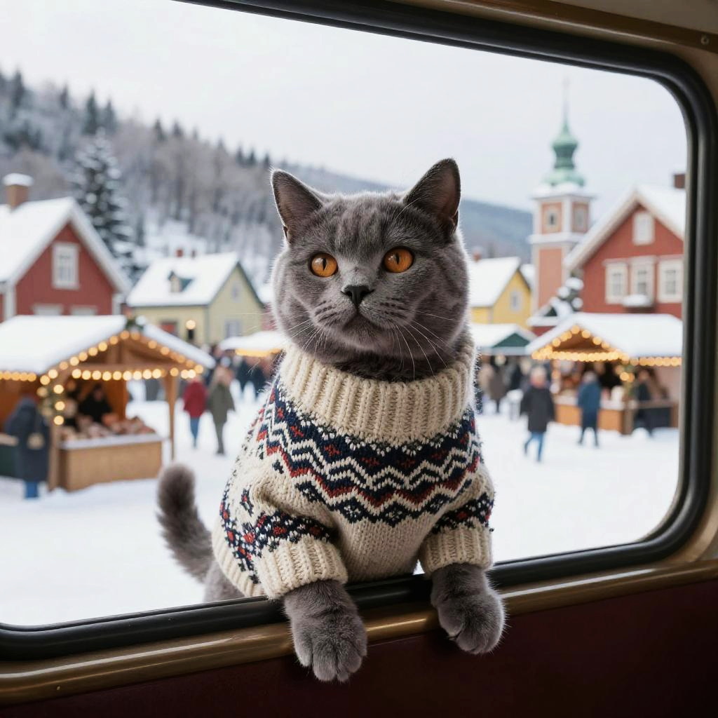 A gray cat wearing a classic detective trench coat and fedora riding a train through a rainy noir city street with vintage cars, Hollywood movie style, hyper-realistic, 8K resolution, natural lighting, cinematic composition