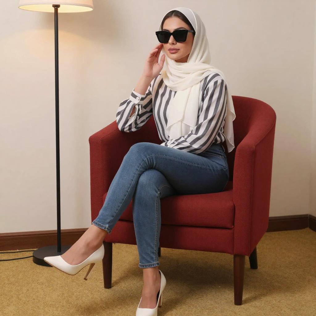 Photograph of a woman with light skin, wearing a pink hijab, black sunglasses, pink blouse, and tight gray jeans, sitting on a gray lounge chair. She has black high heels and a black handbag with a gold clasp. The background features a white balcony with palm plants and a bright blue sky with clouds.