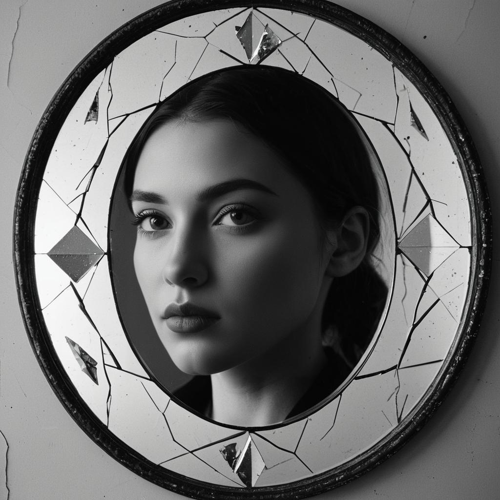 Monochrome portrait: melancholic poet with wistful amber eyes and dusky rose lips. Centered in a surreal frozen mirror fragments, stark contrasts, ethereal shadows. Hyper-detailed, ethereal minimalism blending reality and illusion. Cinematic allure, emotional depth.