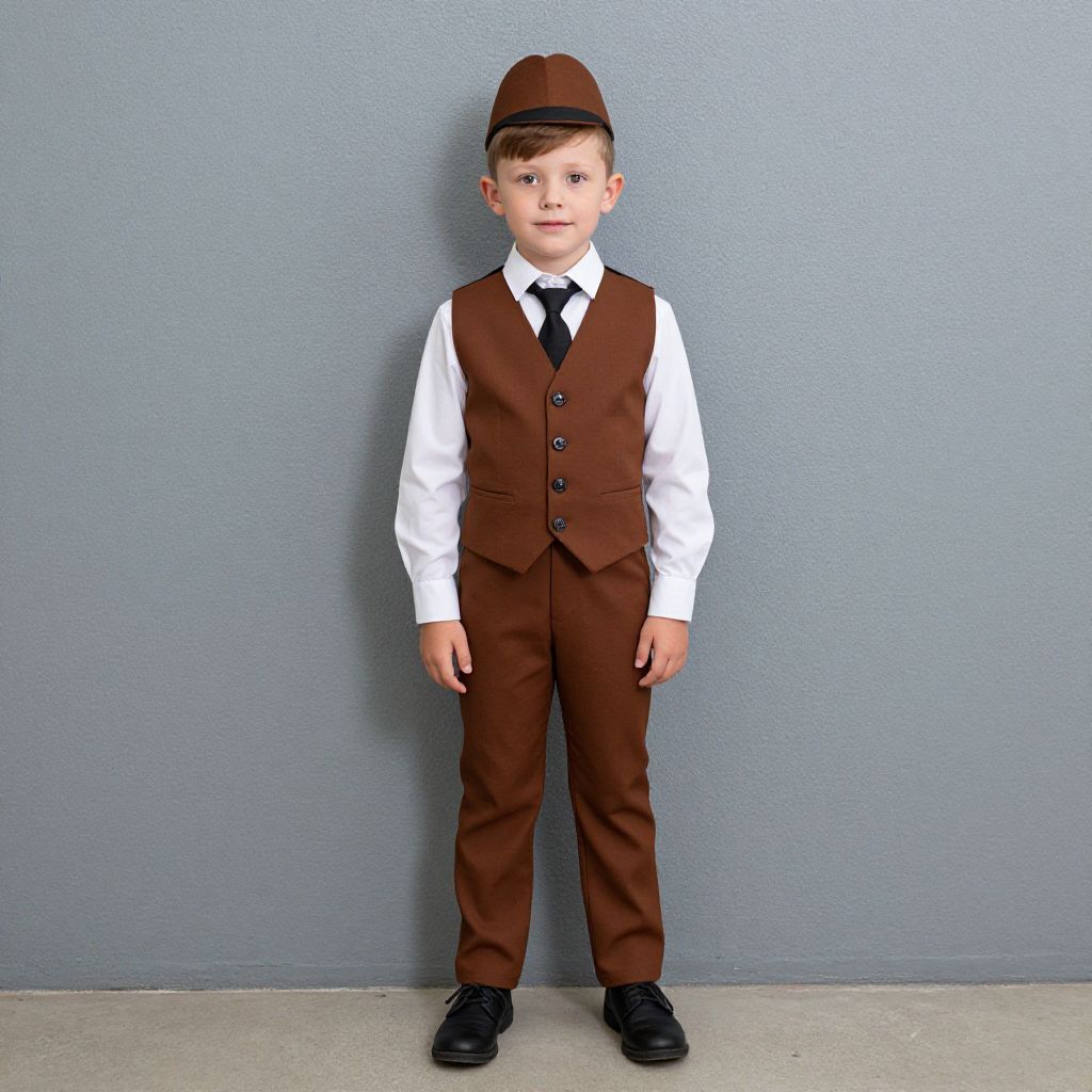 Photograph of a young boy in a brown vest, white shirt, black tie, brown pants, black shoes, and brown hat, standing against a