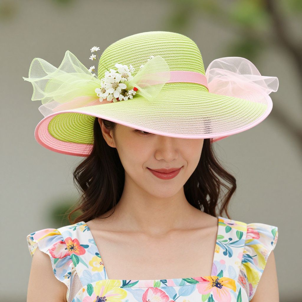 Woman wearing a vibrant lime green and pink Derby hat adorned with sheer fabric accents and delicate white flowers, paired with a matching floral-patterned dress, exudes a cheerful and summery vibe.