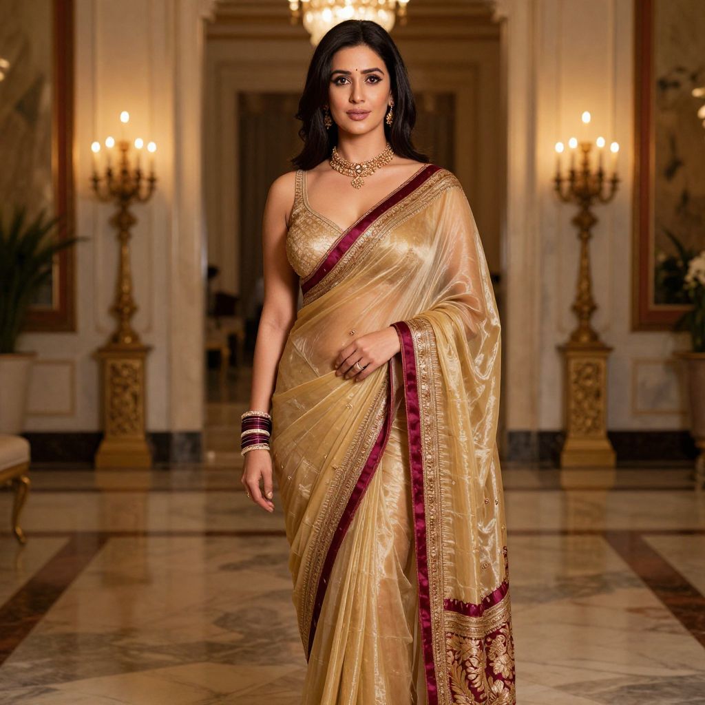 A glamorous woman with long black hair, fair skin, and a confident expression wearing a sheer, golden-banarasi saree with deep crimson borders, attending a sophisticated wedding party in a grand mansion with marble halls and candlelight, the saree cascading down her frame with elegant draping and traditional jewelry like a neck chain and bangles.. The woman has big breasts and cute face