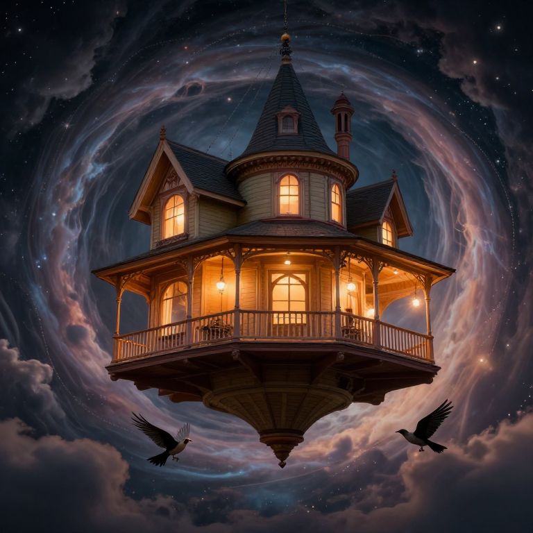 Photorealistic digital illustration of a floating, Victorian-style house with a dark, conical roof and warm, glowing yellow windows. The house hovers in a swirling, cosmic backdrop of deep blue, purple, and pink nebulae, with stars scattered across the dark sky. Two black birds are flying below the house, adding a sense of depth and motion. The house has a wrap-around balcony with ornate railings, and its warm lights contrast with the cool, ethereal background. The overall effect is magical and otherworldly, blending Victorian charm with a celestial, fantasy atmosphere.