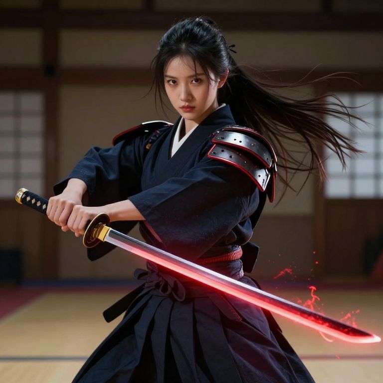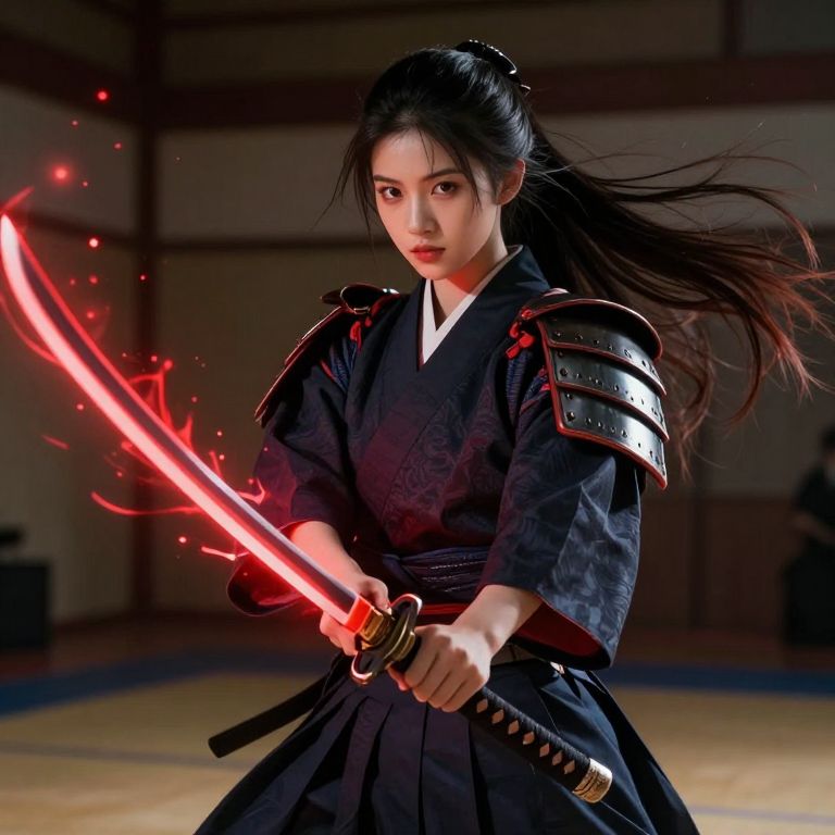 Samurai girl wearing a kimono with shoulder armor, she's holding a katana glowing with red energy, her long hair is flowing in the wind, she stands in a dojo training for her next battle, maximum ultra high definition image quality and rendering, maximum realistic render, ultra realist style), realist side lighting, realist soft lighting, amazing special effect, samurai