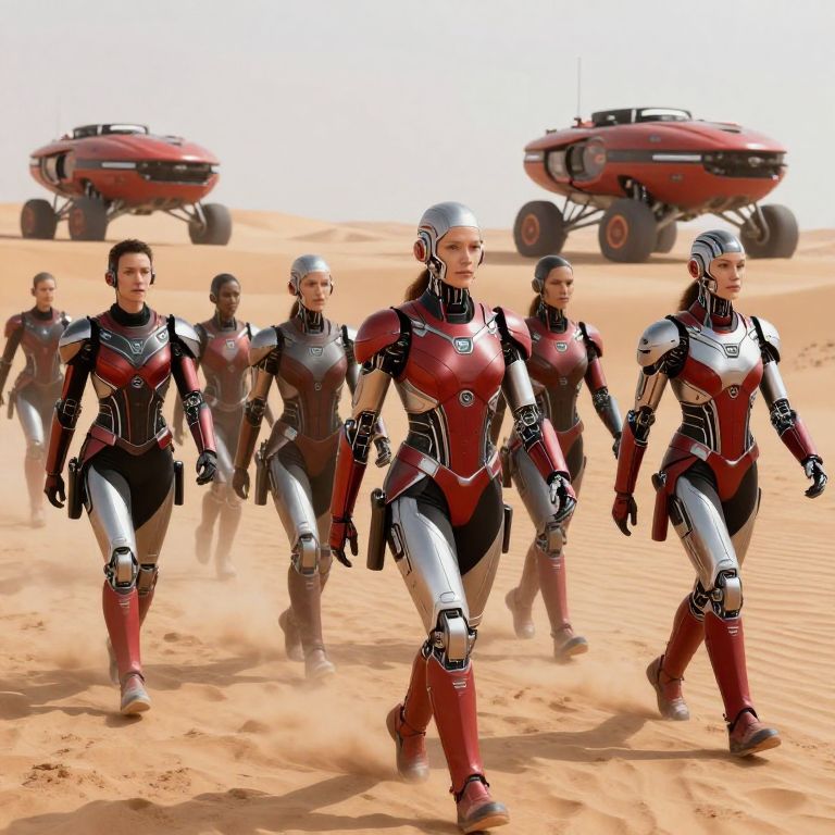 Gang marching through a futuristic desert with hover vehicles in the background, wearing sleek armor and cybernetic enhancements, red and silver color scheme, sci-fi setting, high-resolution, cinematic view, MidJourney style.