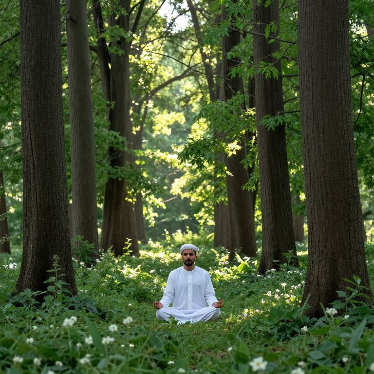Photograph of an Indian man with a beard, wearing a white kurta, meditating cross-legged in a sunlit, dense forest. Tall trees