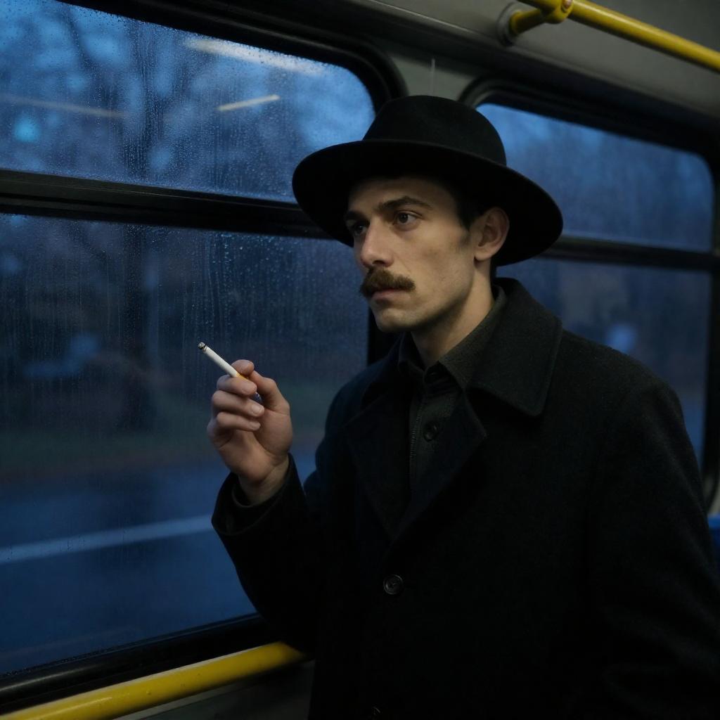 Portrait of a man wearing a black fedora hat and brown overcoat, holding two large brown paper shopping bags. The man has a serious expression and stands in a doorway framed by wooden panels. The background is softly lit, creating contrast with the darker tones of the man's clothing.
