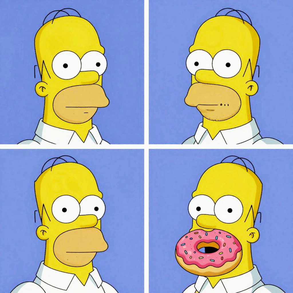 A collage of four digitally edited images of Homer Simpson from "The Simpsons." Each square shows Homer with a different exaggerated facial feature: top left has a giant nose and mustache, top right has glasses and a beard, bottom left has a white beard and glasses, and bottom right has a giant pink donut in his mouth. Backgrounds are solid blue.