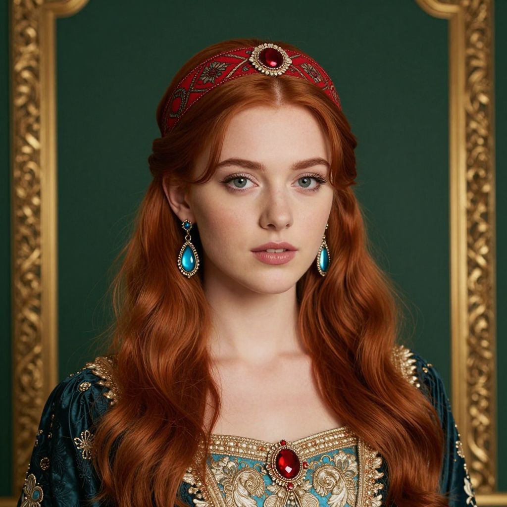 Photograph of a young white woman with long, wavy red hair wearing a detailed red headband adorned with a central gem. She has fair skin, blue eyes, and wears blue teardrop earrings with a red gem. Her black and gold embroidered dress features a red gem at the neckline. The background is a dark green with a gold, ornately framed portrait. The woman's expression is neutral, and she is centered in the frame, highlighting her regal appearance. The image has a fantasy or royalty theme.