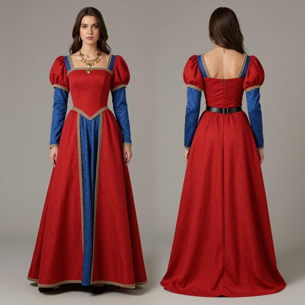Woman showcasing a vibrant red and blue medieval-style gown with intricate details, including puffed sleeves, a fitted bodice, and a full skirt, complemented by gold jewelry and a black belt, captured from both front and back views against a neutral background.