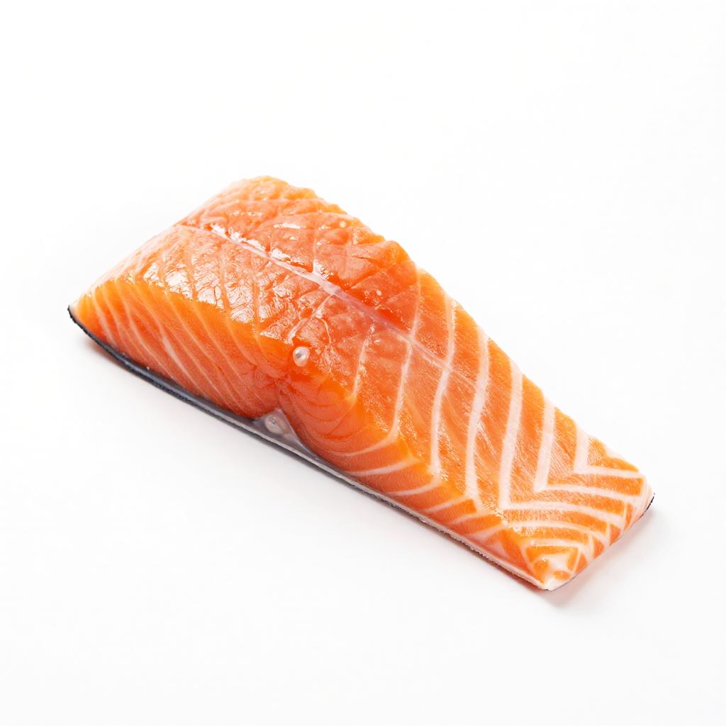 Photograph of a single, triangular piece of bright orange salmon fillet, slightly glossy with a soft texture. The piece is positioned slightly off-center to the right, against a stark white background, making the vivid color of the salmon stand out. The edges of the fillet are slightly jagged, and there's a small, dark pinkish spot near the top.