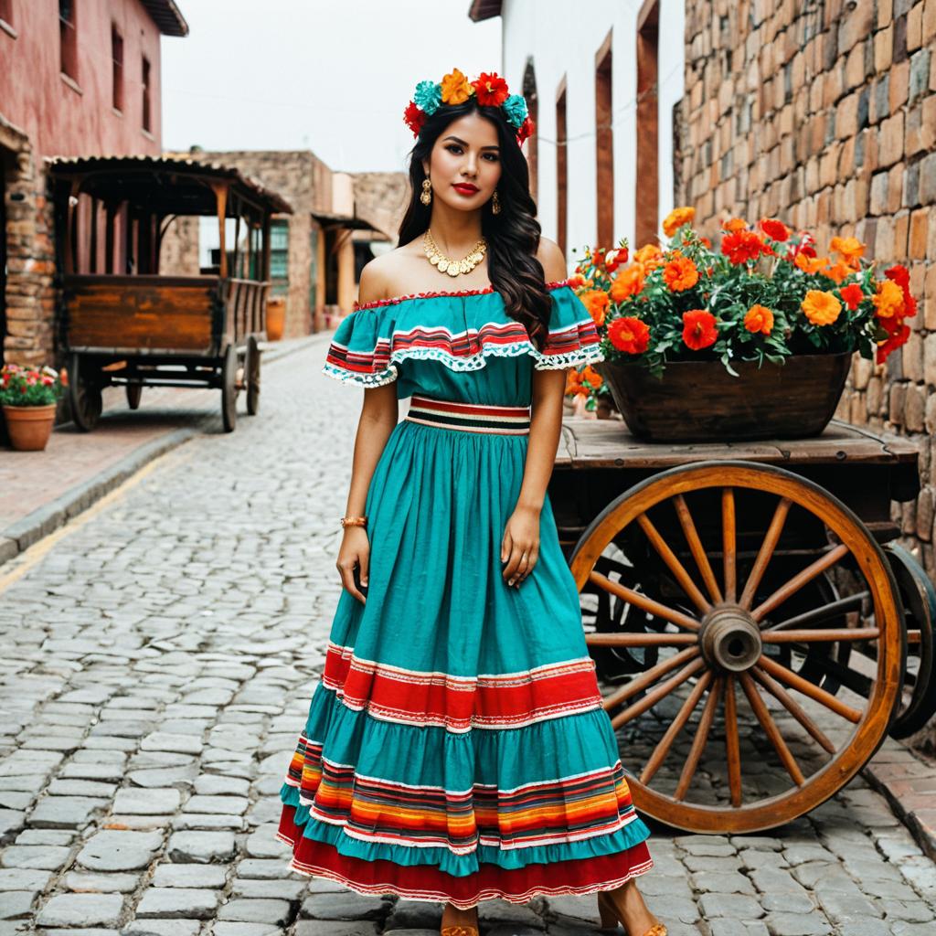 Mexican dress party, photograph of beautiful woman, Mexican style, off-the-shoulder traditional dress, red and teal stripes, ruffled sleeves, flower crown, gold necklace, standing on cobblestone street, rustic wall background, old wagon wheel, orange and red flowers, daytime, ethnic fashion, traditional attire, natural light, bohemian style