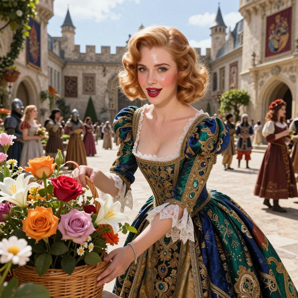 (perfect lighting:1.2), (dynamic photoshoot pose:1.2), (Layered Depth, Parallax Effect, Soft focus foreground, sharp 3d render:1.3), (high quality:1.4), (best quality:1.4), (masterpiece:1.4), official art, official wallpaper, surreal, (detailed landscape:1.1), (whimsical atmosphere:1.1), (powerful energy:1.1), vibrant colors, (detailed:1.05), (extremely detailed:1.06), sharp focus, (intricate:1.03), cinematic lighting, (extremely intricate:1.04), (adorned:1.09), fFaceDetail HairDetail OverallDetail (perfect seductive young woman selling magical flowers:1.3), (perfect seductive young woman selling magical flowers:1.3), (25 years old, small perky covered breasts, cleavage, skinny+, slender, young woman:1.2), (Oval-shaped face, luminous complexion, Bright almond-shaped eyes looking at viewer, [[dewy skin, peach and rose blush, minimal warm eyeshadow, subtle freckles]], Arched defined eyebrows, berry red lipgloss, dimple, subtle highlights, retrouss├й nose, bow-shaped lips side smiling, cheeky, Mischievous Sly+ smirk:1.2), (Sleek Hollywood Waves short bob hair, [blonde:red:0.6] hair Vintage Pinup Style, Gelled Curls:1.3), subtle makeup emphasizing natural beauty, vibrant medieval castle courtyard, bright sunlight, raditional Renaissance gown, voluminous skirt with rich embroidery, deep jewel tones - emerald greens and sapphire blues, intricately patterned gold brocade, delicate lace accents at the cuffs and neckline, basket of vividly roses, lilies, and daisies, styled to appear freshly picked, background bustling with castle life - knights, courtiers, and minstrels, intricate stone carvings and hanging tapestries, lively atmosphere with a sense of historical authenticity, a blend of [fantasy:realism:0.9], creating an immersive and captivating scene