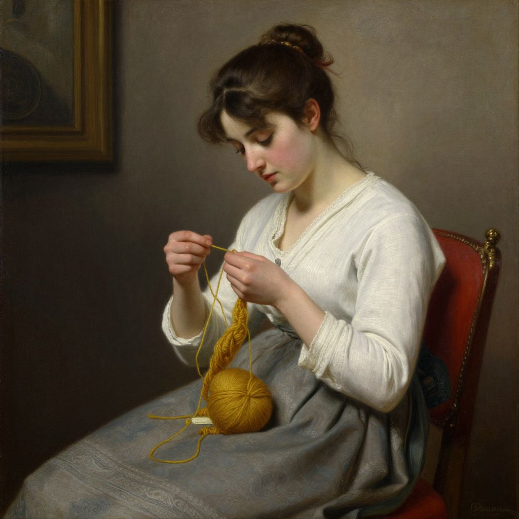 Photograph-style digital painting of a young woman with fair skin and dark hair, in a white blouse and gray skirt, sitting and knitting a yellow ball