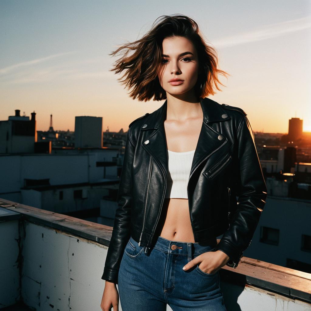 Shaggy Bob hairstyle on young woman, wearing leather jacket and ripped jeans, in industrial rooftop, captured in fashion editorial style with golden hour sunlight.